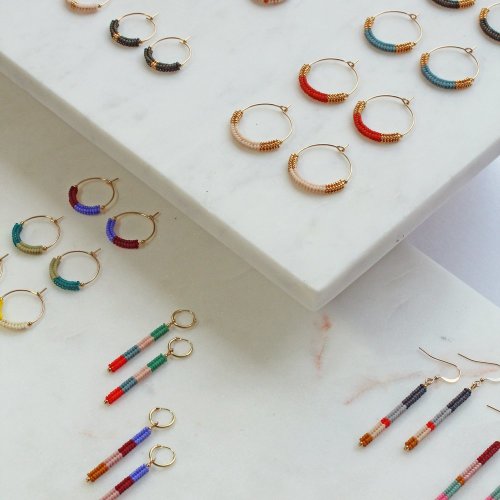 Er wordt gewerkt met glaskralen van hoge kwaliteit, elk met een diameter van minder dan twee millimeter. Met naald en draad worden de kralen met de hand geweven tot elegante en unieke oorbellen.