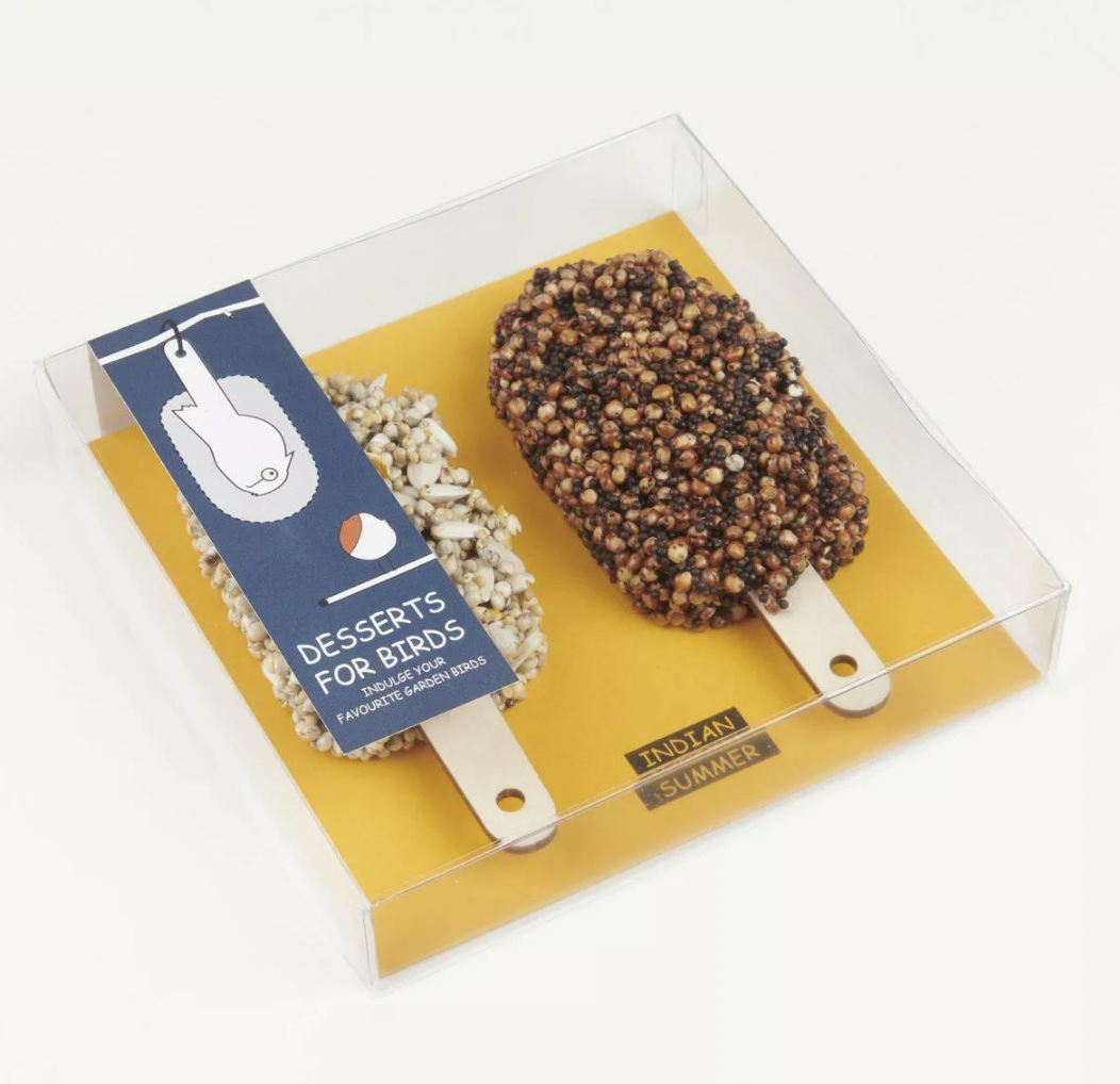 Leuke verrassing: nadat de vogels het toetje met smaak hebben verorberd, komt er een origineel lasergesneden ijsstokje tevoorschijn, in de vorm van een roodborstje, een koolmeesje of een halsbandparkietje. De ‘ijsjes’ worden per twee verpakt in een transparant doosje, zodat de ijsjes goed zichtbaar zijn. Ideaal als cadeautje toch ;)