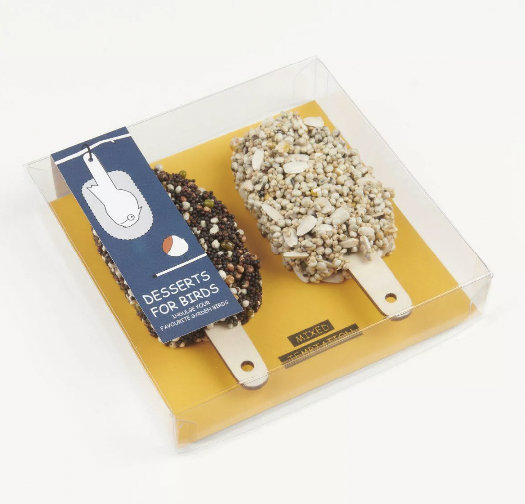 Leuke verrassing: nadat de vogels het toetje met smaak hebben verorberd, komt er een origineel lasergesneden ijsstokje tevoorschijn, in de vorm van een roodborstje, een koolmeesje of een halsbandparkietje. De ‘ijsjes’ worden per twee verpakt in een transparant doosje, zodat de ijsjes goed zichtbaar zijn. Ideaal als cadeautje toch ;)