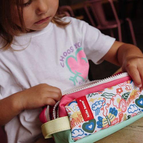 Deze vrolijke pennenzak met twee compartimenten heeft het perfecte formaat om mee te nemen naar school! Hij volgt je kind overal, ook op vakantie! Kenmerken: Twee compartimenten met rits. Afmetingen: H8 x B22 x D8cm. Inhoud: 1.4 liter