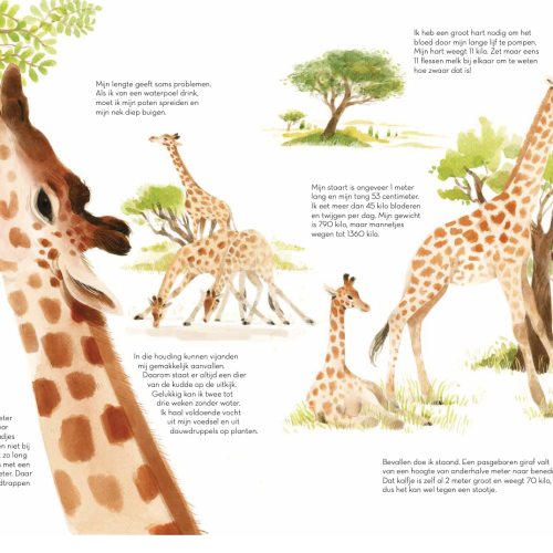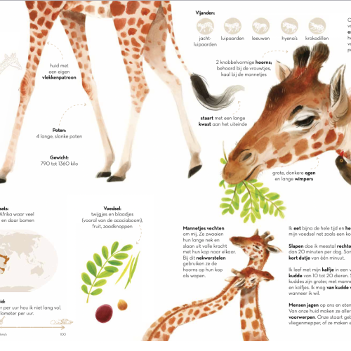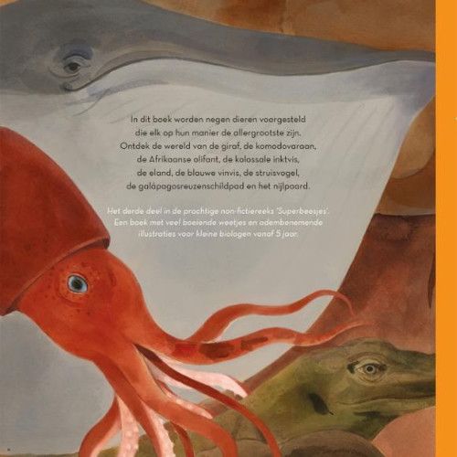 In dit boek worden 9 dieren voorgesteld die elk op hun manier de allergrootste zijn. Ontdek de wereld van de giraf, de komodovaraan, de Afrikaanse olifant, de kolossale inktvis, de eland, de blauwe vinvis, de struisvogel, de galápagosreuzenschildpad en het nijlpaard.