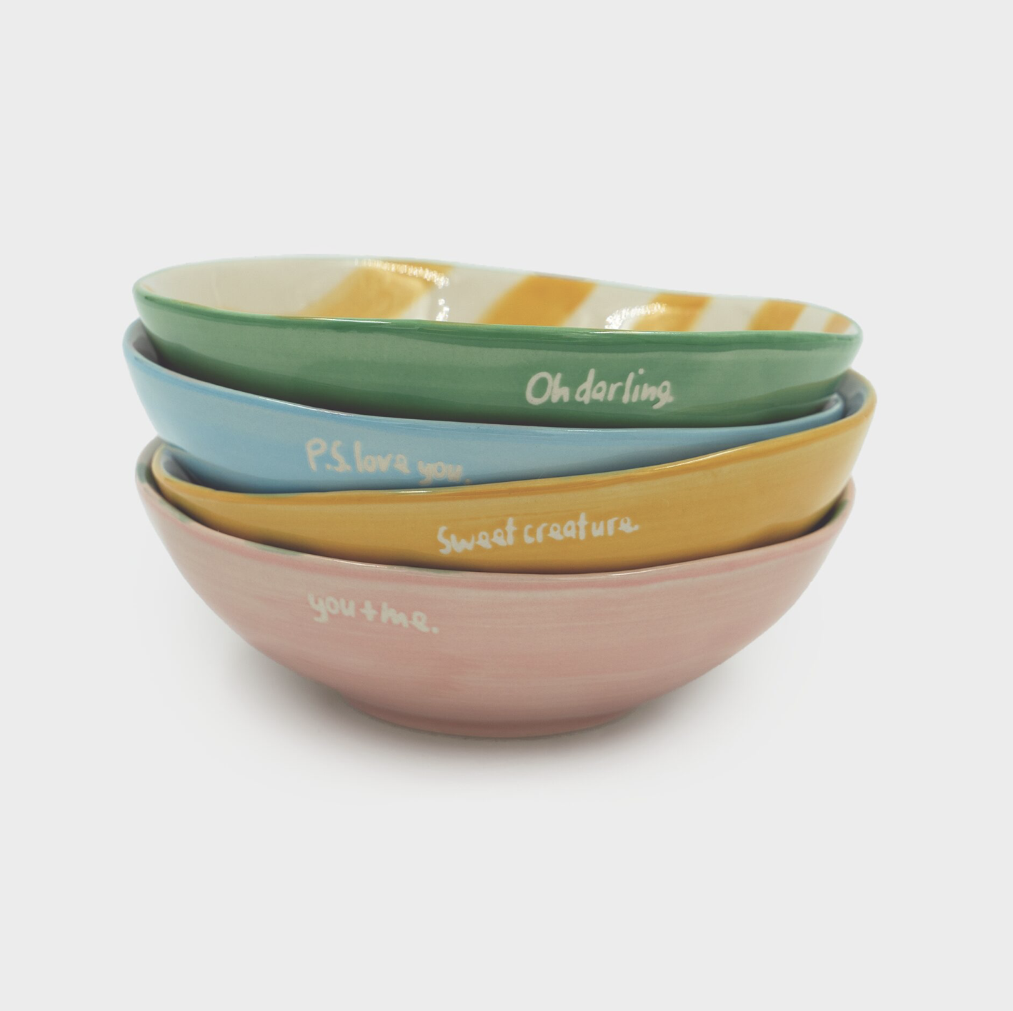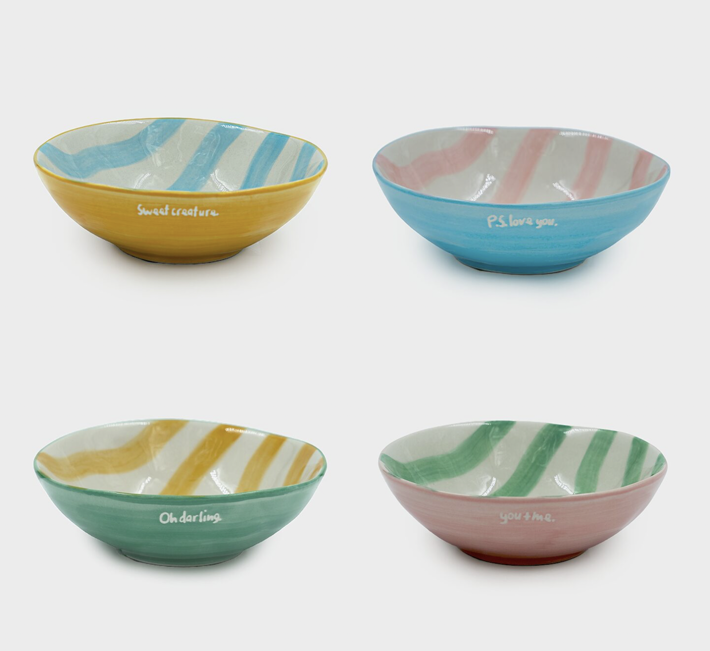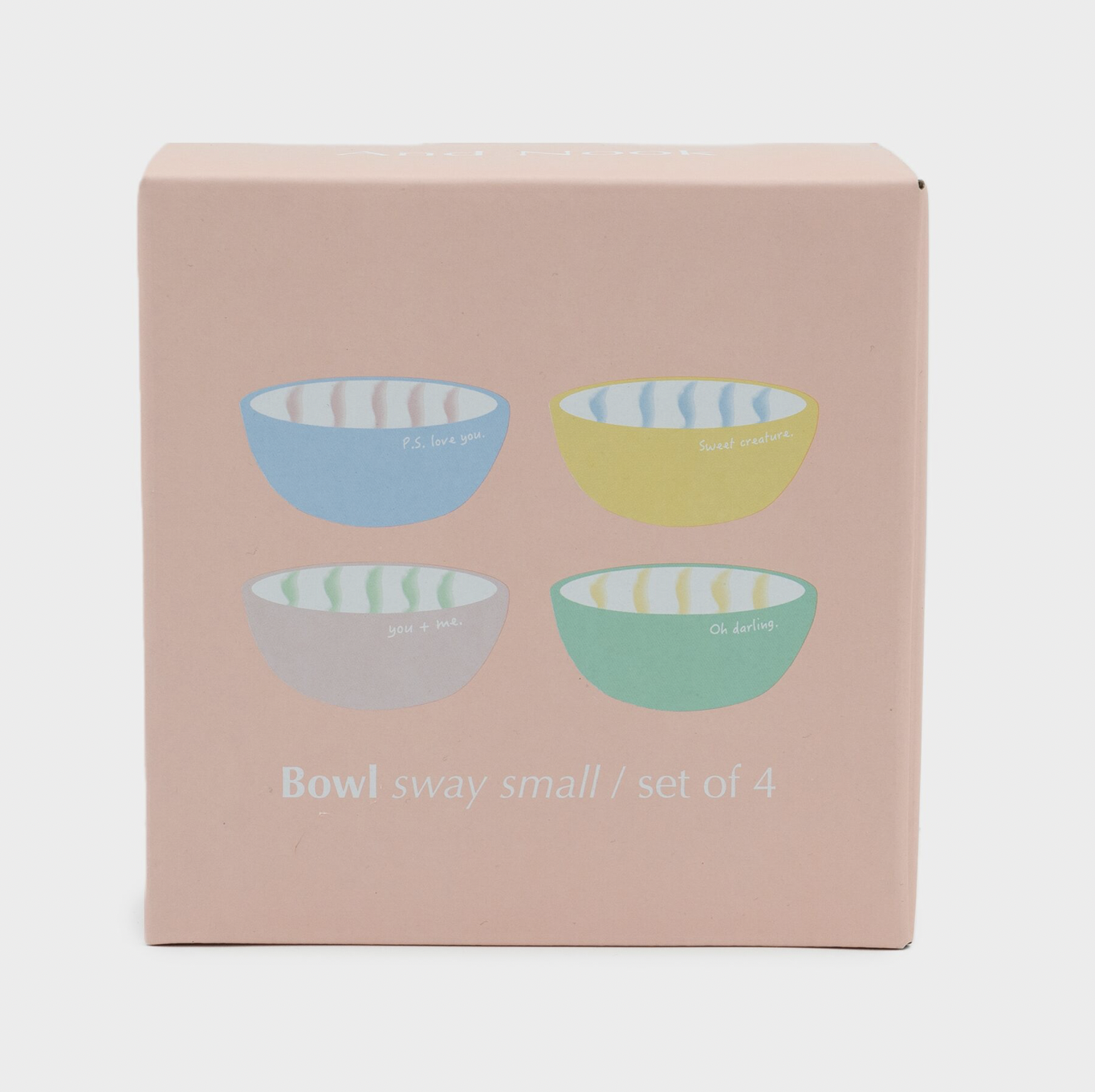 De kleine kommetjes uit de Sway collectie zijn perfect voor olijven, nootjes, een amuse of zelfs als lief sieradenbakje. De set bevat vier kommetjes van 13 centimeter doorsnede en 5 centimeter hoog. Elk exemplaar heeft een eigen kleur, speelse golvende strepen en een lieve tekst aan de buitenkant, zoals "p.s. love you" of "you + me", gedrukt in voelbaar reliëf.