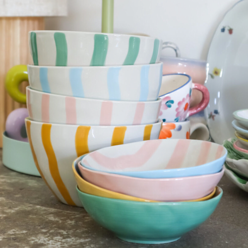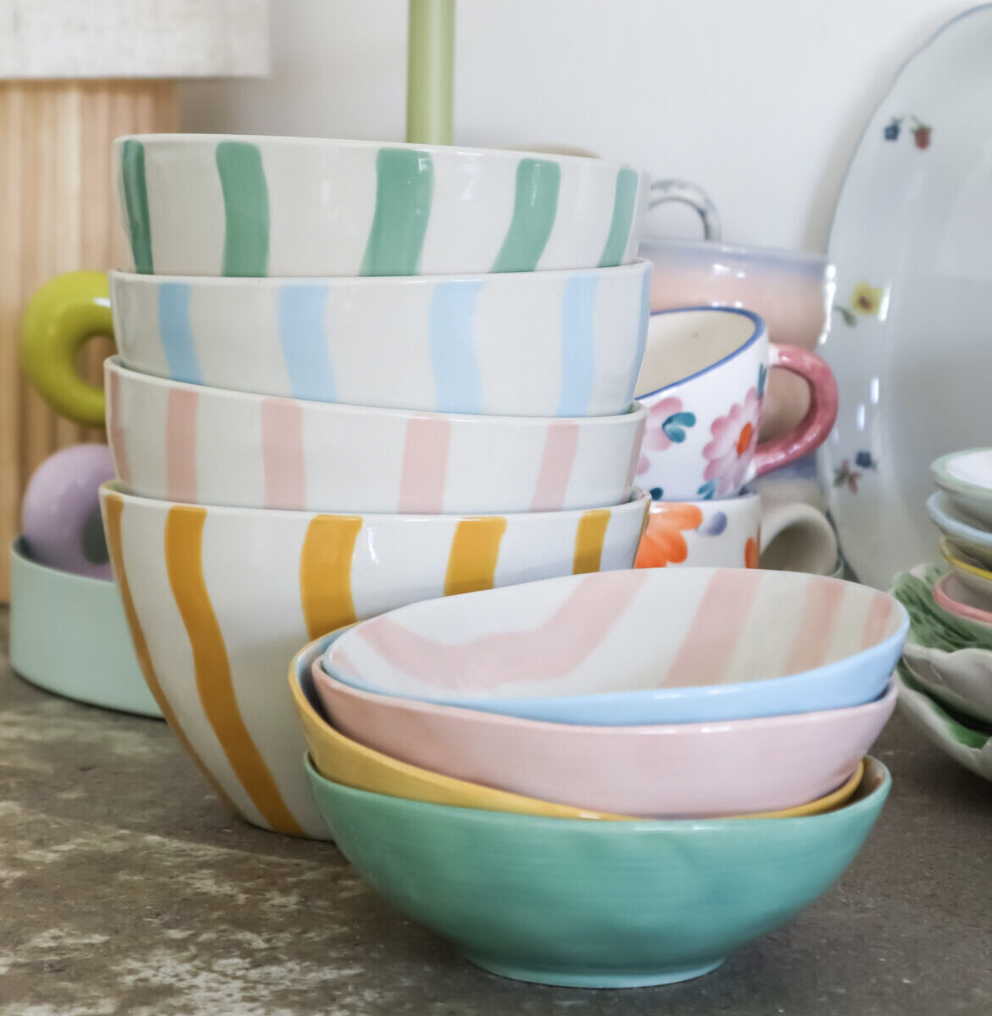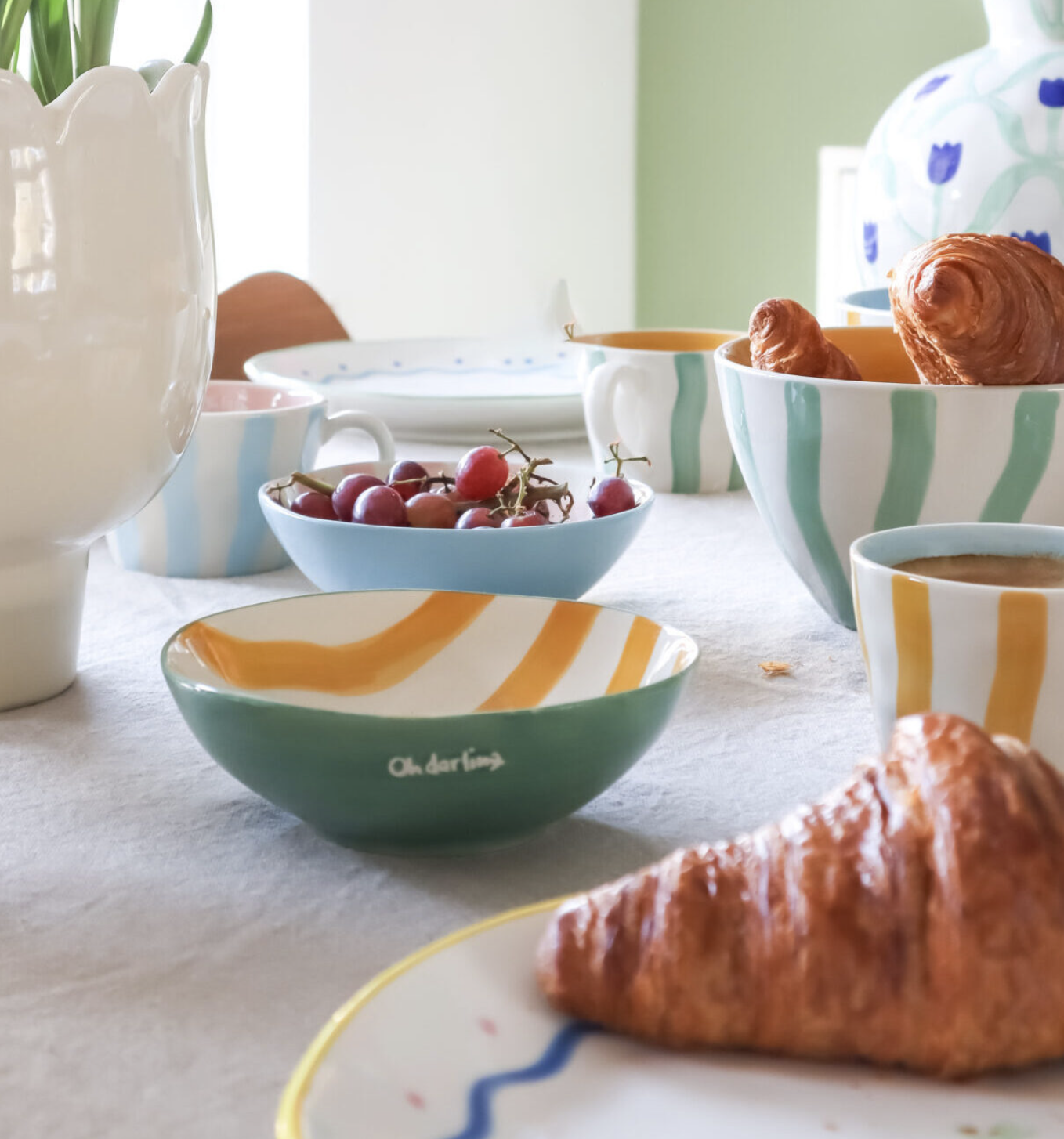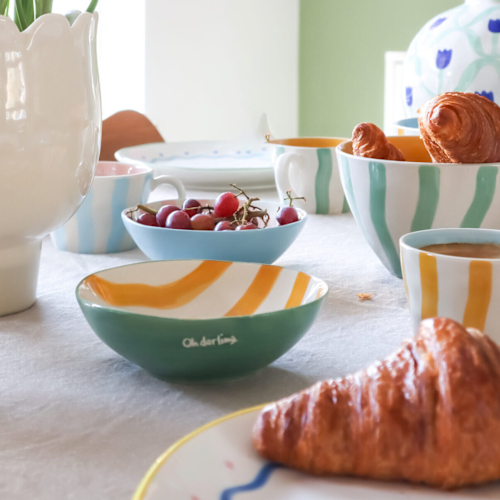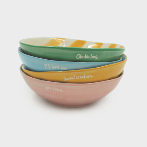 De kleine kommetjes uit de Sway collectie zijn perfect voor olijven, nootjes, een amuse of zelfs als lief sieradenbakje. De set bevat vier kommetjes van 13 centimeter doorsnede en 5 centimeter hoog. Elk exemplaar heeft een eigen kleur, speelse golvende strepen en een lieve tekst aan de buitenkant, zoals "p.s. love you" of "you + me", gedrukt in voelbaar reliëf.