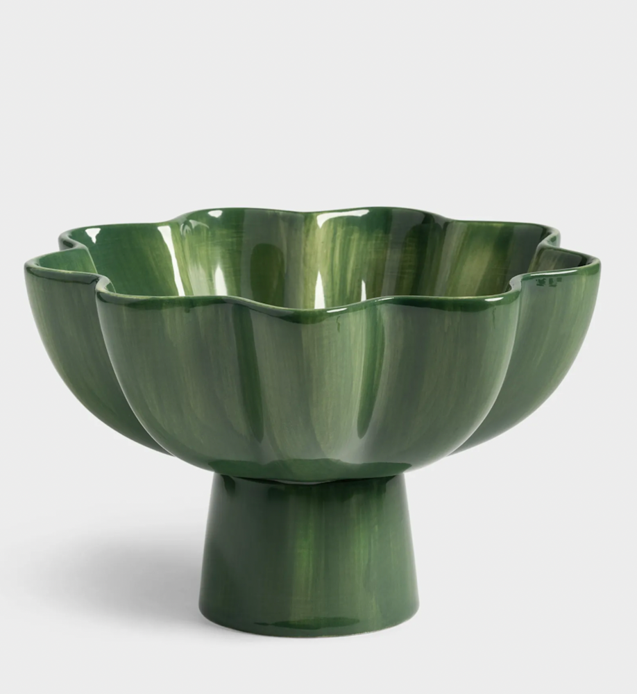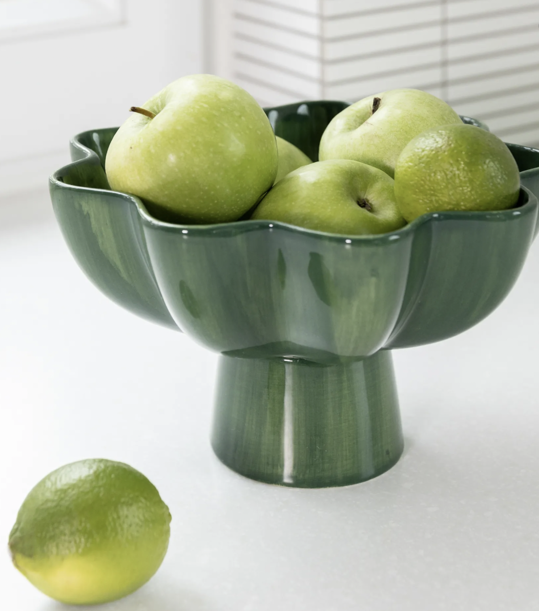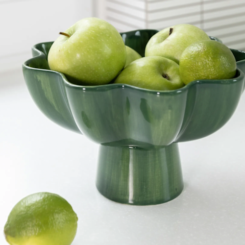 Ontdek deze leuke fruit bowl op voet met speelse vorm en warme kleur.