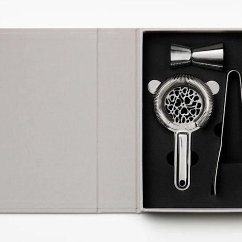 Introduceer de essentiële kit voor het maken van de meest verfrissende cocktails - een verfijnde gereedschapskist in een elegante boekdoos. Binnenin vind je een ijstang, een Hawthorne zeef, en een jigger, essentiële hulpmiddelen voor je perfecte cocktail ;)