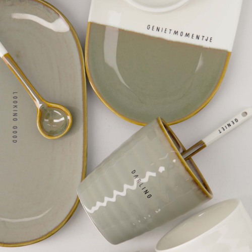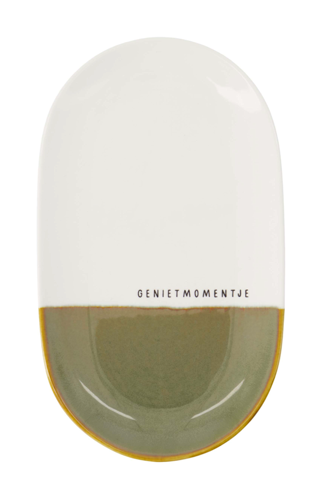 De Zusss serveerschaal is een mooie toevoeging voor je keukencollectie. Deze serveerschaal valt op door het warme wit gecombineerd met een warmgroene onderkant en de subtiele tekst 'genietmomentje'. Perfect om hapjes of broodjes stijlvol te presenteren. Dankzij het keramische materiaal voelt de schaal stevig en kwalitatief aan, en is hij eenvoudig te combineren met andere tafelspullen.
