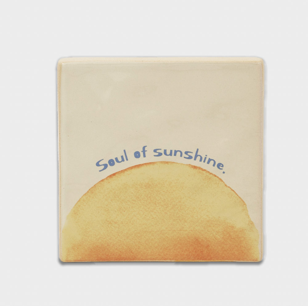 Deze schattige keramische tegel is geglazuurd in een witte kleur en bevat een tekening van een zonsondergang.
