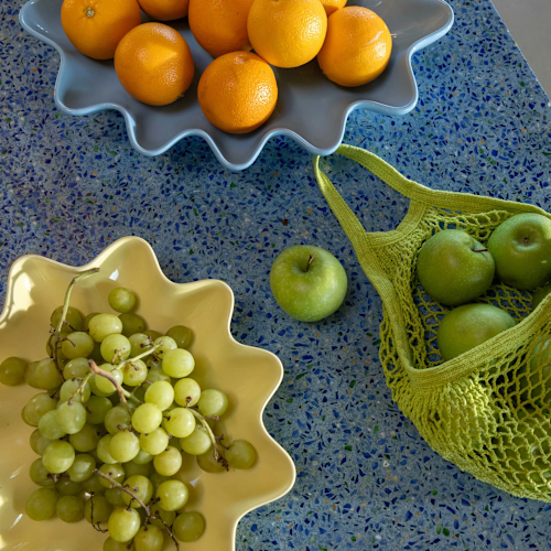 Ontdek deze leuke fruit bowl op voet met speelse vorm en warme kleur.
