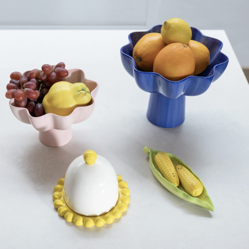 Ontdek deze leuke fruit bowl op voet met speelse vorm en warme kleur.