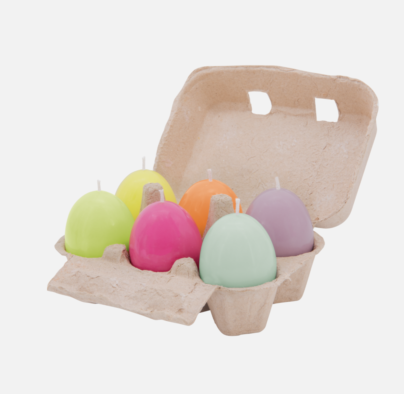 Welke kip heeft deze eieren gelegd? Open het eierdoosje om zes verschillende gekleurde kaarsen in de vorm van eieren te onthullen.