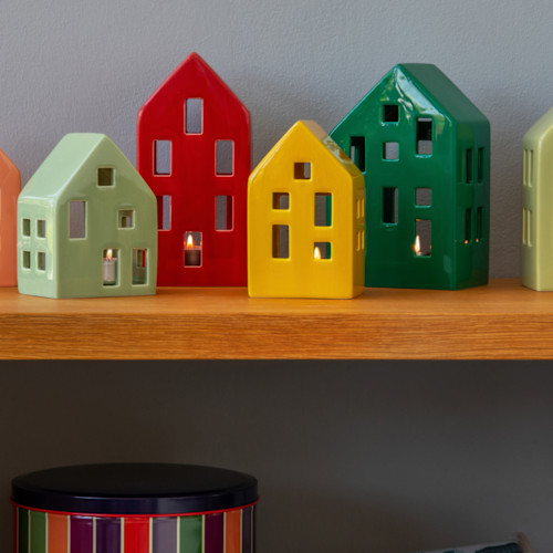 Gezelligheid troef met de warme gloed die uit deze huisjes komt. Ideaal voor de donkere dagen die eraan komen ... Mooi op zichzelf of als kleine stad ;) Eigenschappen - Materiaal: Dolomite - Afmetingen: 15x9x6 cm