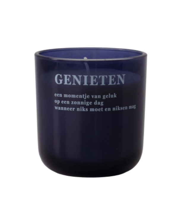 De Zusss geurkaars brengt écht genieten in huis. Deze donkerblauwe kaars met de uitnodigende tekst ‘GENIETEN’ geeft rust en warmte, perfect voor een moment van geluk op een zonnige dag. Dankzij het stevige glazen potje staat deze geurkaars mooi in elke kamer en is hij een subtiele eyecatcher tijdens jouw dagelijkse rustmoment.