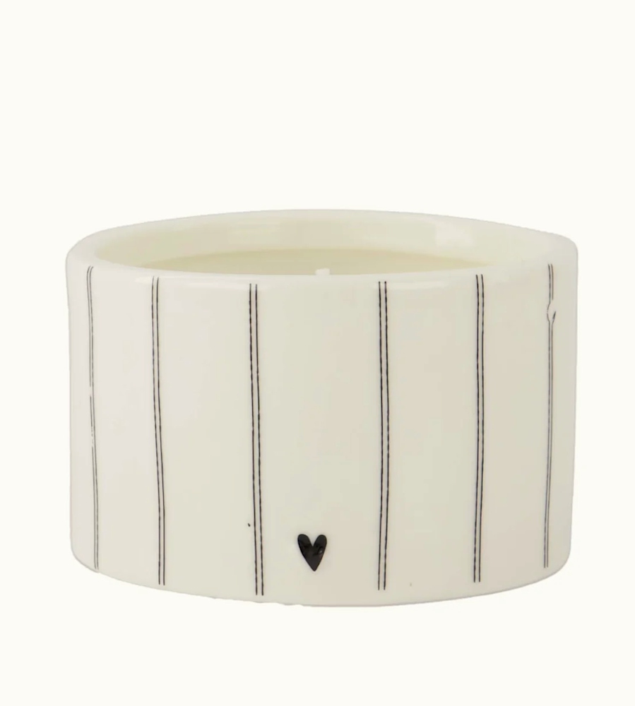 De Zusss geurkaars keramiek met strepen en hartje brengt warmte en stijl in huis. Deze geurkaars keramiek combineert een tijdloos zandkleurige basis met subtiele antracietgrijze strepen en een klein zwart hartje, wat zorgt voor een sfeervolle, minimalistische uitstraling.