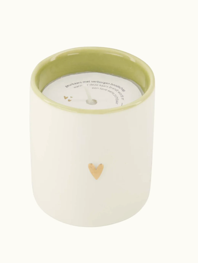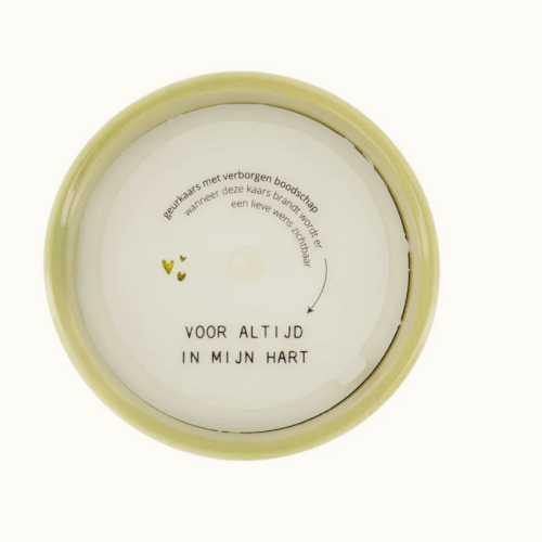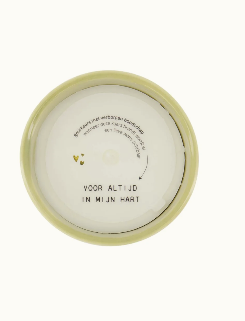 De Zusss geurkaars 'voor altijd in mijn hart' brengt warmte en rust in huis. Deze geurkaars valt op door het subtiele, liefdevolle hartje op de zijkant en de zachte, bruine rand aan de binnenzijde. Dankzij het keramiek blijft de kaars stabiel en stijlvol, ideaal voor een plek waar je vaak tot rust komt. Zo creëer je een warme, troostende sfeer met deze Zusss geurkaars.