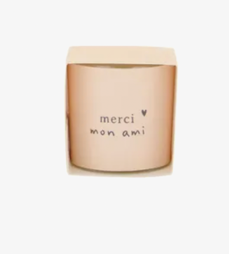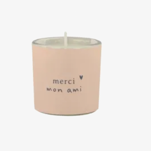 Dit geurkaarsje van Zusss ziet er zo gezellig uit! En hij ruikt ook nog eens heerlijk naar 'fresh cotton.' Om dit kaarsje zit een zalmkleurige wikkel met 'Merci mon ami'. Aan wie geef jij dit?