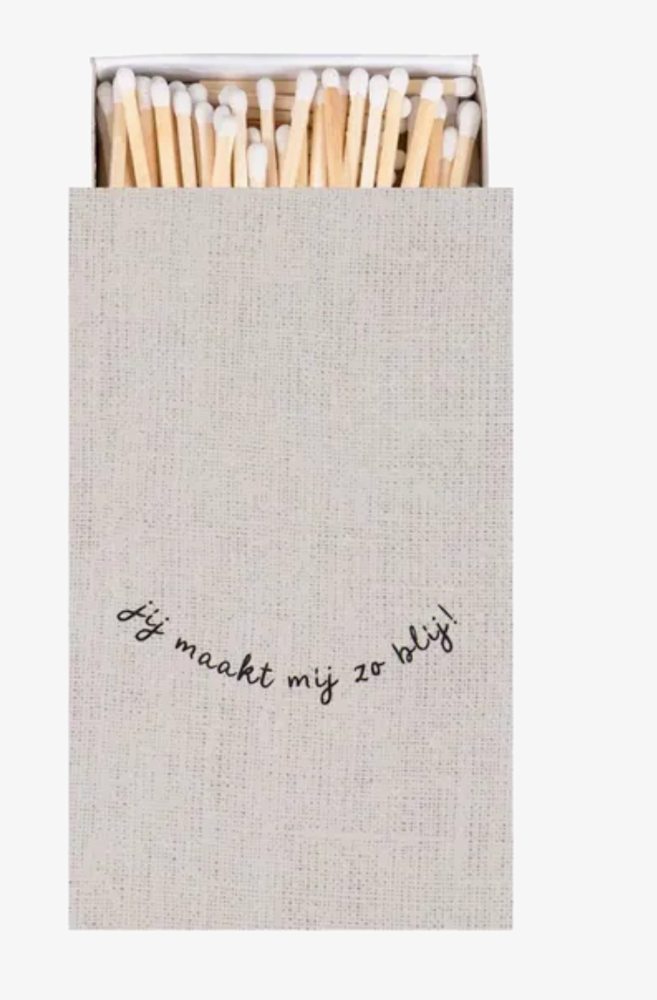 Dit doosje lucifers van Zusss mag zeker gezien worden! De lucifers zijn verpakt in een lichtgrijs doosje met de tekst: jij maakt me zo blij. Wie wil jij opvrolijken? Zusss: basic, stoer, uniek en een tikkeltje eigenwijs.