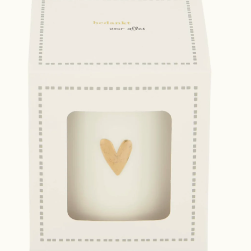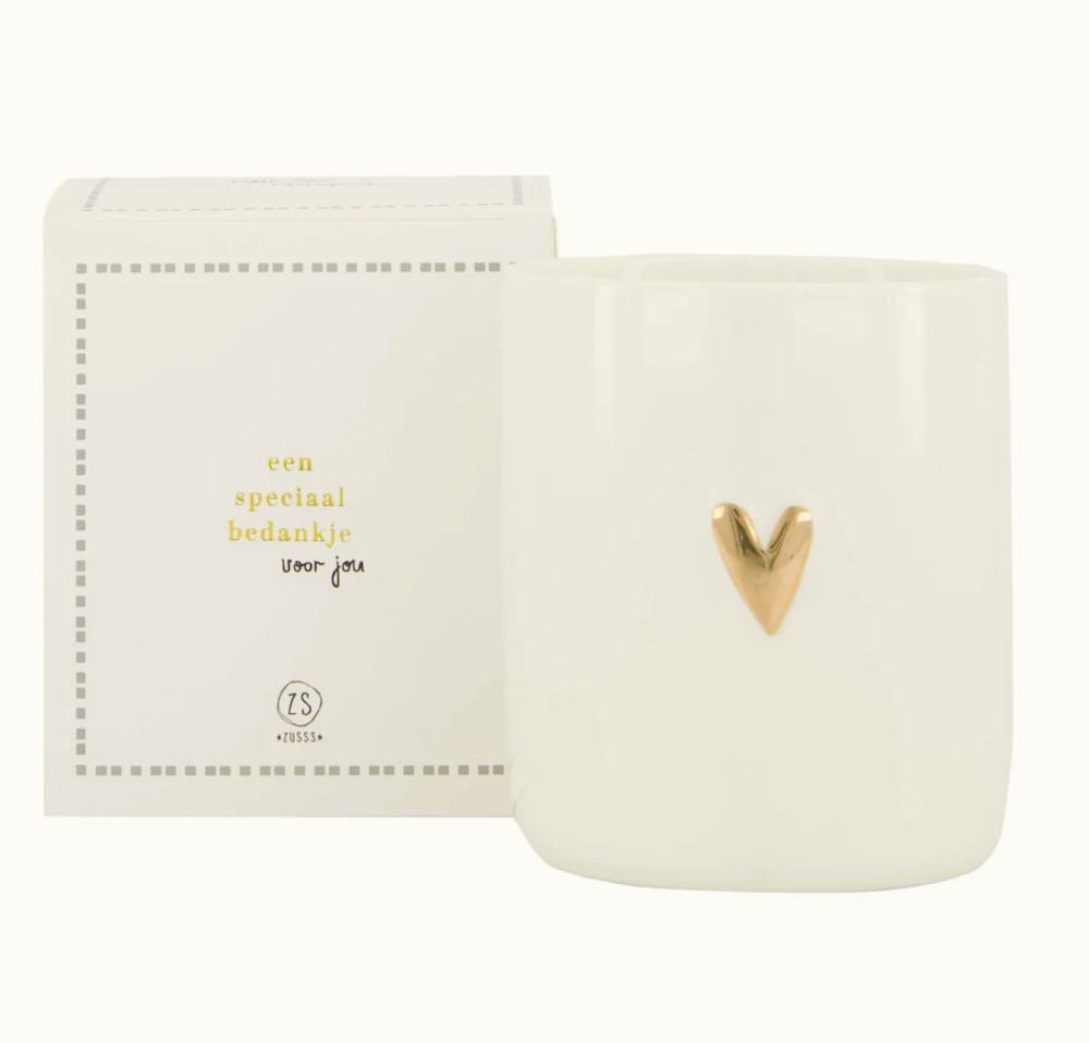 De Zusss geurkaars keramiek is een subtiel en sfeervol cadeau voor in de woonkamer. Deze keramische kaars met een goudkleurig hartje straalt warmte uit en past mooi bij elk interieur.