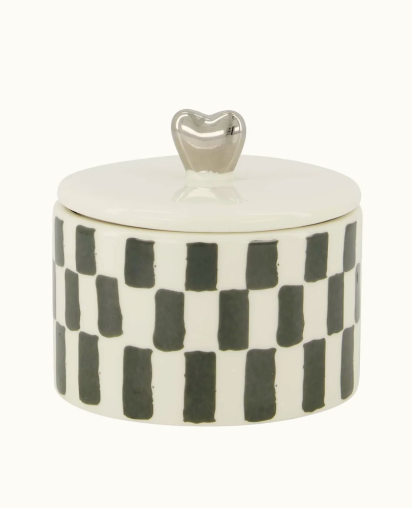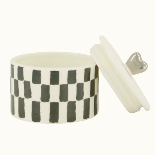 De Zusss geurkaars keramiek met deksel is een echte eyecatcher in je woonkamer. Deze geurkaars keramiek met deksel combineert een stijlvol wit/grijsblauw ruitpatroon met een zilverkleurig hartje op het deksel.