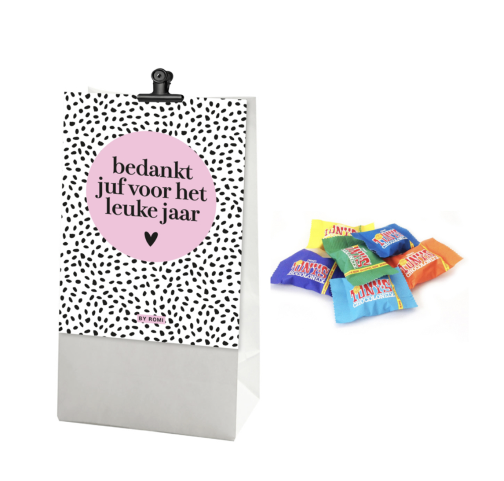 Dit zakje is gevuld met heerlijke Tony Chocolonely chocolaatjes. Het zakje bevat een kaart, vastgemaakt met een klem, waarop je nog een mooie boodschap voor je juf kan neerschrijven.