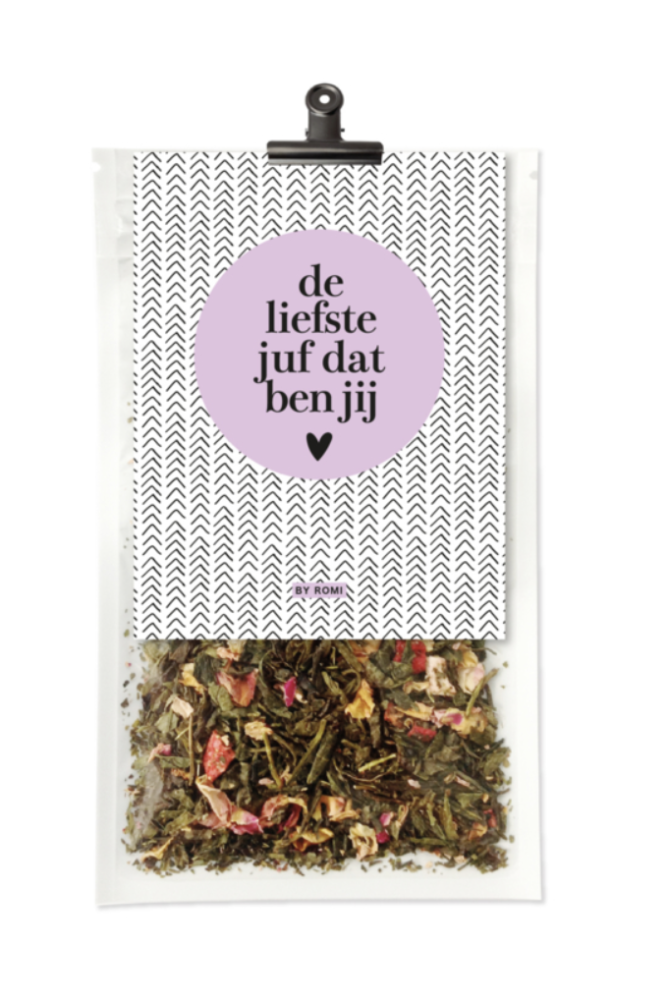 Dit zakje is gevuld met 20 gram heerlijke groene thee aardbei & rozenbloesem en voorzien van een kaartje om de mooiste boodschap achter te laten voor je juf.