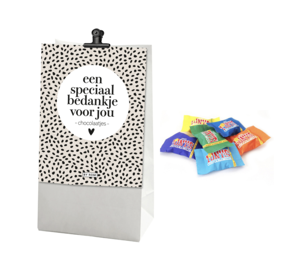 Dit zakje is gevuld met heerlijke Tony Chocolonely chocolaatjes en bevat een kaartje waarop je een leuke boodschap kan schrijven voor je juf of meester.