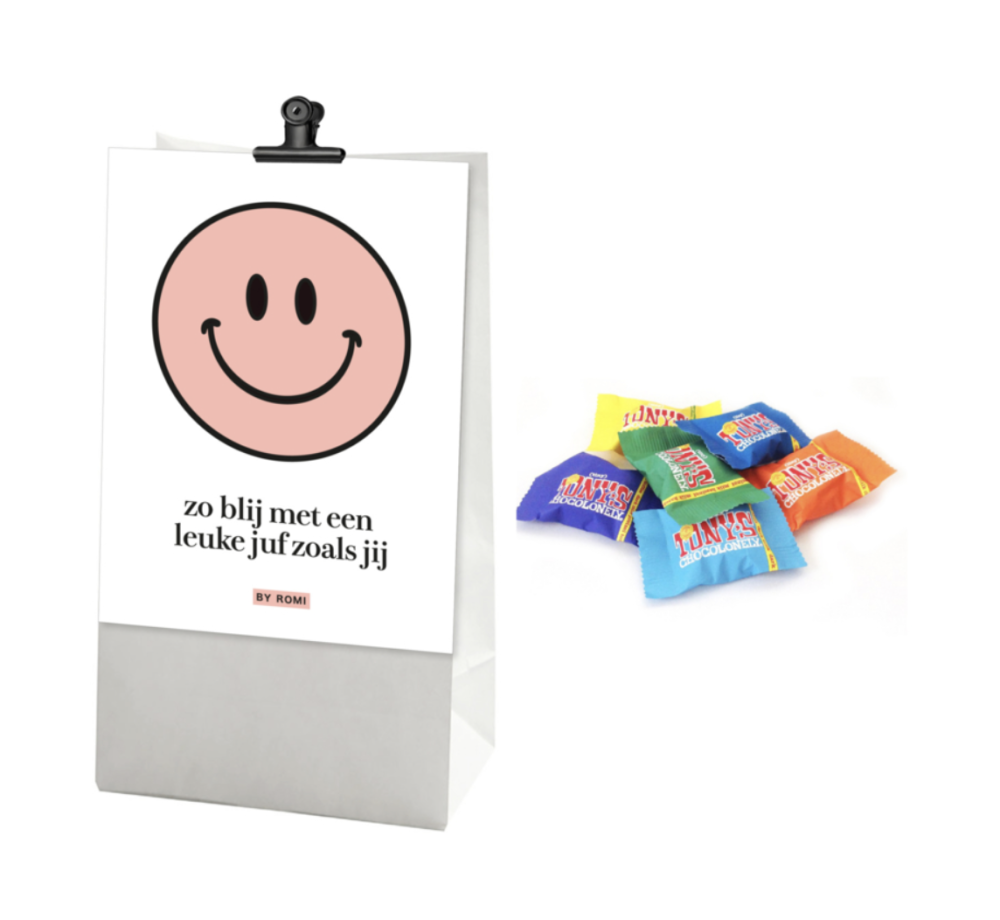 Dit zakje van By Romi is gevuld met heerlijke Tony Chocolonely chocolaatjes. Het zakje bevat een kaart, vastgemaakt met een klem. De achterzijde van het kaartje is blanco voor een persoonlijke tekst.