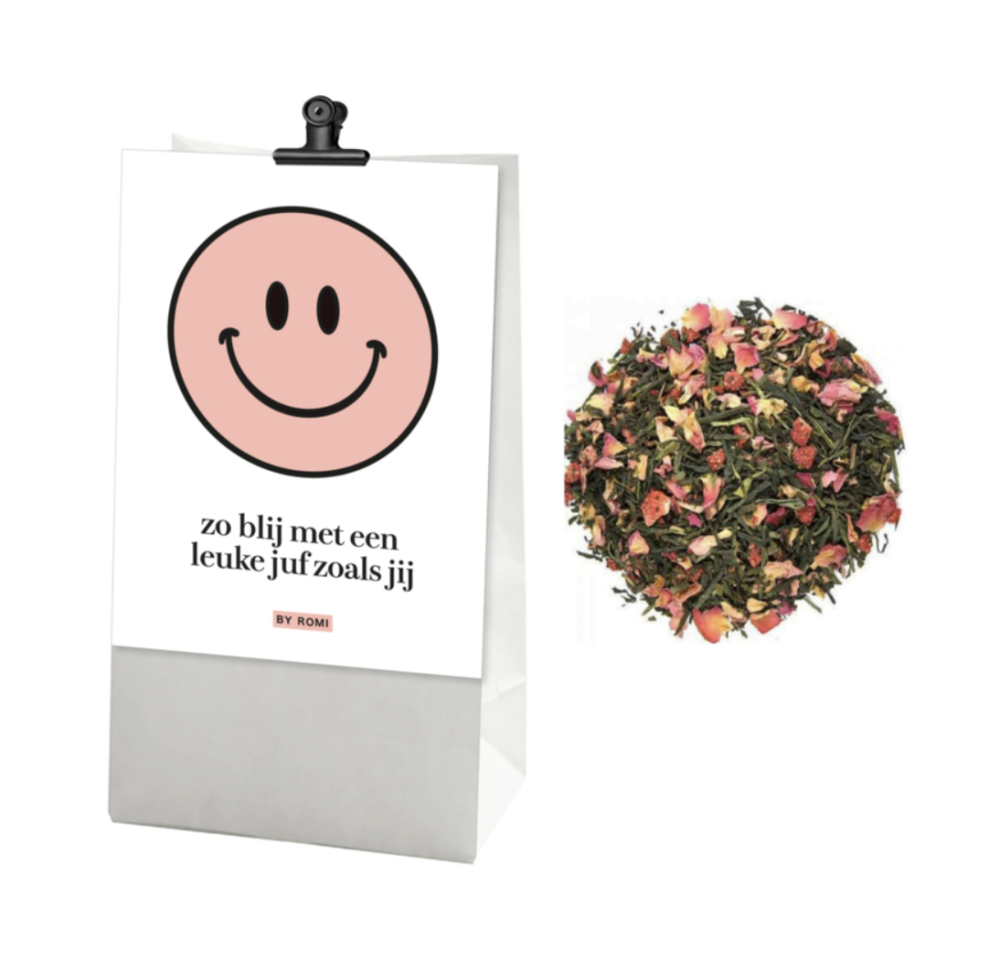 Dit zakje van By Romi is gevuld met heerlijke groene thee, aardbei & rozenbloesem. Het zakje bevat een kaartje, vastgemaakt met een klem, waarop je de liefste boodschap voor je juf kan neerschrijven.