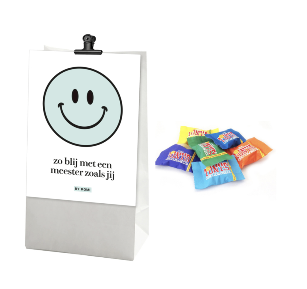 Dit zakje is gevuld met heerlijke Tony Chocolonely chocolaatjes. Het zakje bevat een kaartje vastgemaakt met een klem. Ideaal voor een persoonlijke tekst.