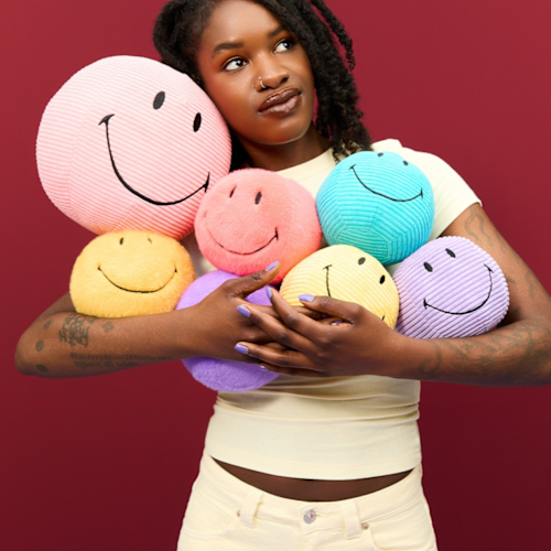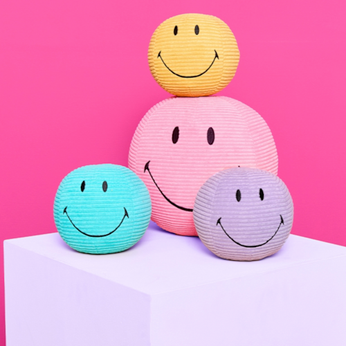Instant happiness met deze vrolijke smileys in corduroy stof. Een knipoog in je zetel of een nieuwe vriend voor je kids. Gezelligheid verzekerd!