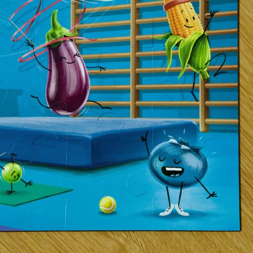 Dubbel plezier met deze knappe puzzel! Vervolledig beide kanten van de omkeerbare puzzel en sport mee met Barry en zijn fruitige vrienden.