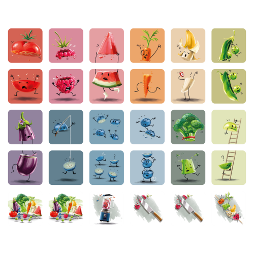 Het concept: Help! De fruit en groenten vrienden zijn door een groot, scherp mes in twee stukken gesneden. Ze zitten diep in de puree. Helpen jullie hun onderkant terug te vinden? Een fruitig geheugenspelletje met 2 moeilijkheidsniveaus om zowel jongere als oudere spelers te bekoren.