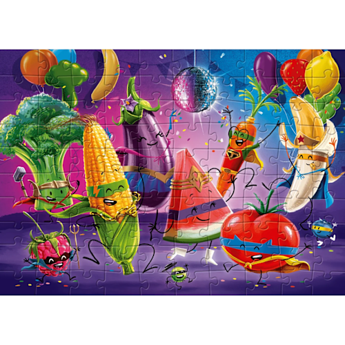 Dubbel plezier met deze knappe puzzel! Vervolledig beide kanten van de omkeerbare puzzel en ontdek de fruitige taferelen. Ontdek de kracht van supernacho en laat je fantasie de vrije loop tijdens het puzzelen.