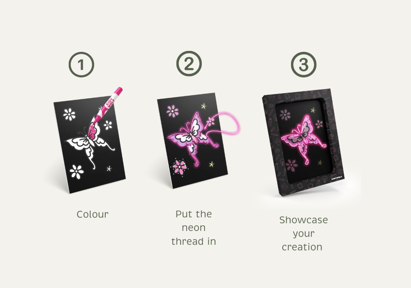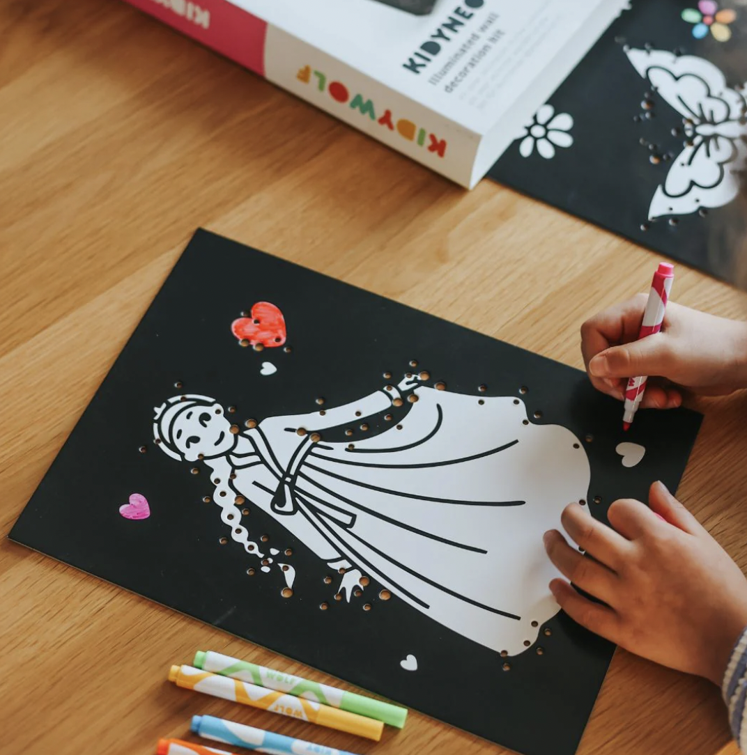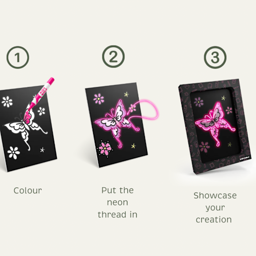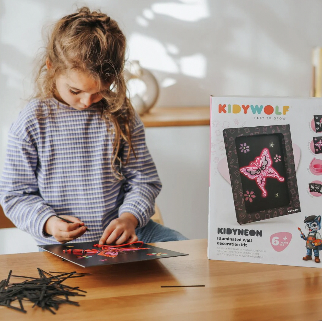 KIDYNEON geeft creatieve hobby's een nieuwe dimensie door er een vleugje magische verlichting aan toe te voegen! Met behulp van neonkleurige draad die in een voorgeperforeerd bord wordt bevestigd, maken kinderen schitterende, originele kunstwerken die ze trots kunnen tentoonstellen. Een handvaardige activiteit die de creativiteit stimuleert en tegelijkertijd de fijne motoriek en concentratie ontwikkelt. Zonder scherm, 100% boeiend!