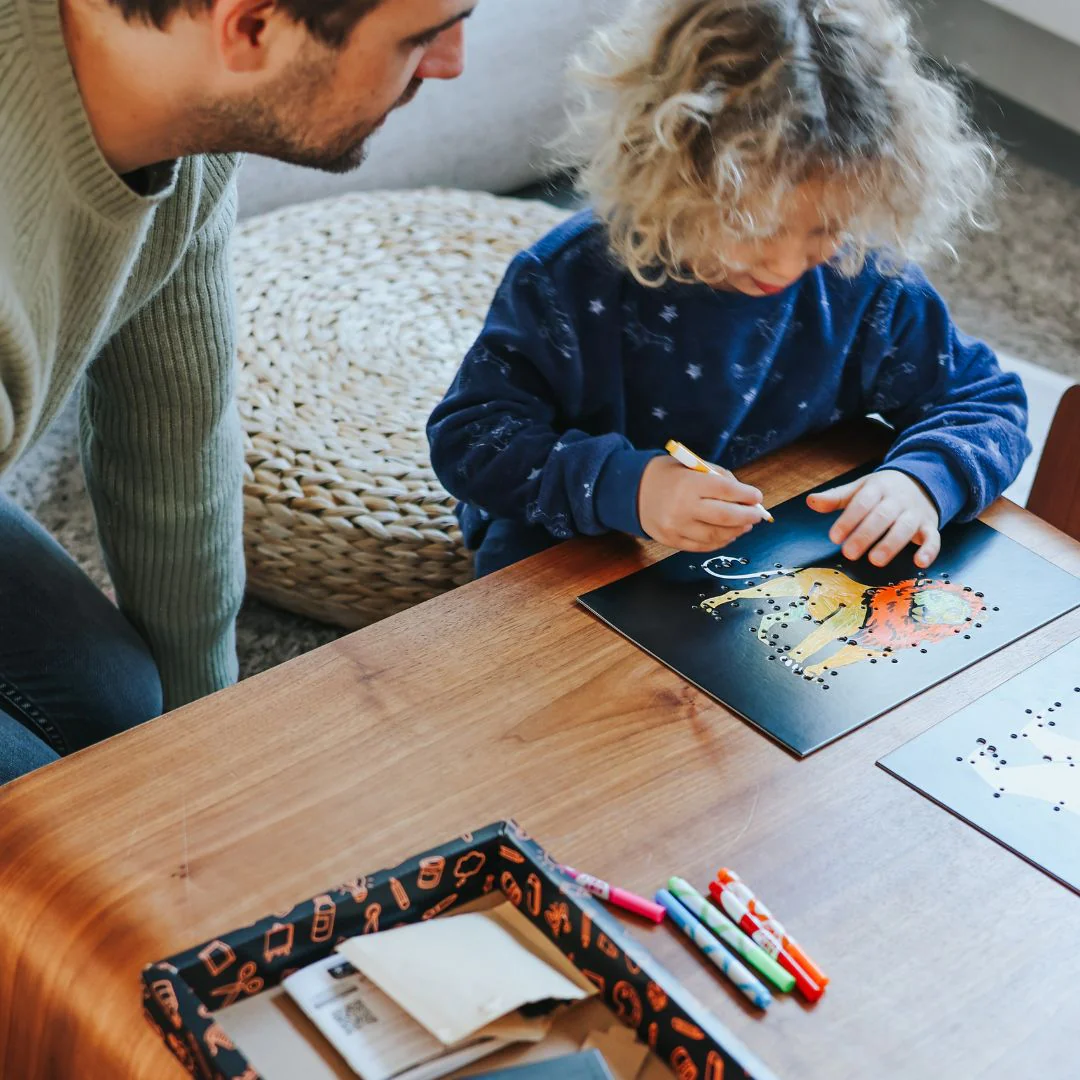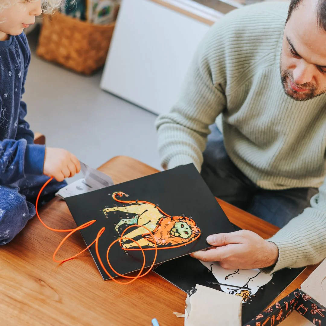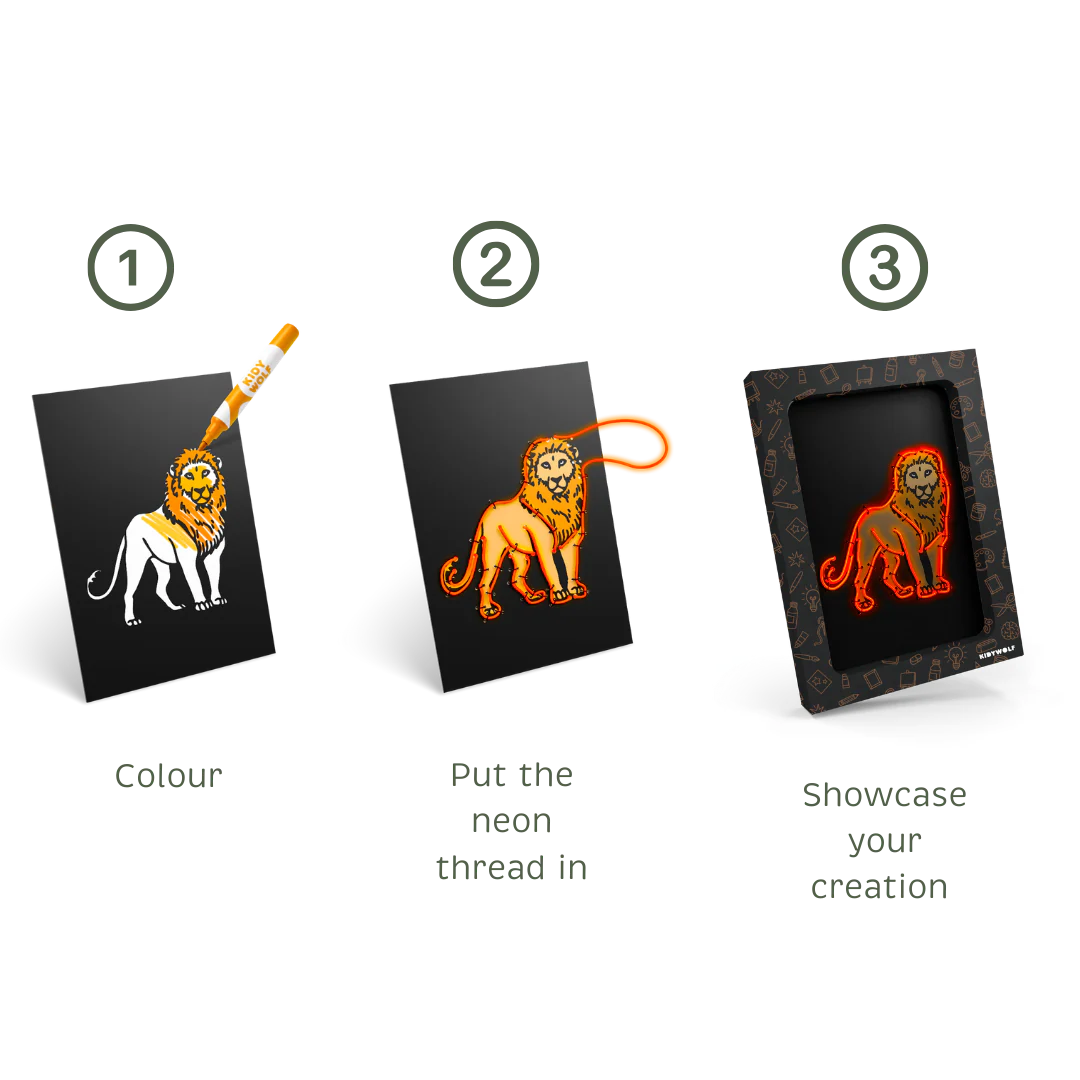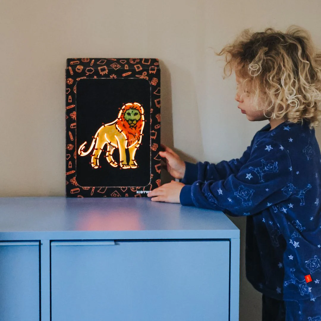 KIDYNEON geeft creatieve hobby's een nieuwe dimensie door er een vleugje magische verlichting aan toe te voegen! Met behulp van neonkleurige draad die in een voorgeperforeerd bord wordt bevestigd, maken kinderen schitterende, originele kunstwerken die ze trots kunnen tentoonstellen. Een handvaardige activiteit die de creativiteit stimuleert en tegelijkertijd de fijne motoriek en concentratie ontwikkelt. Zonder scherm, 100% boeiend!