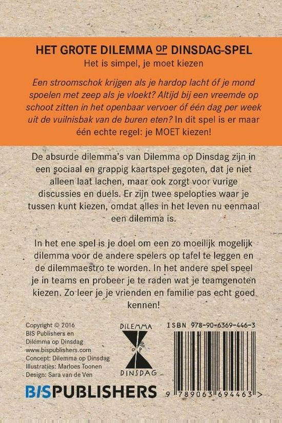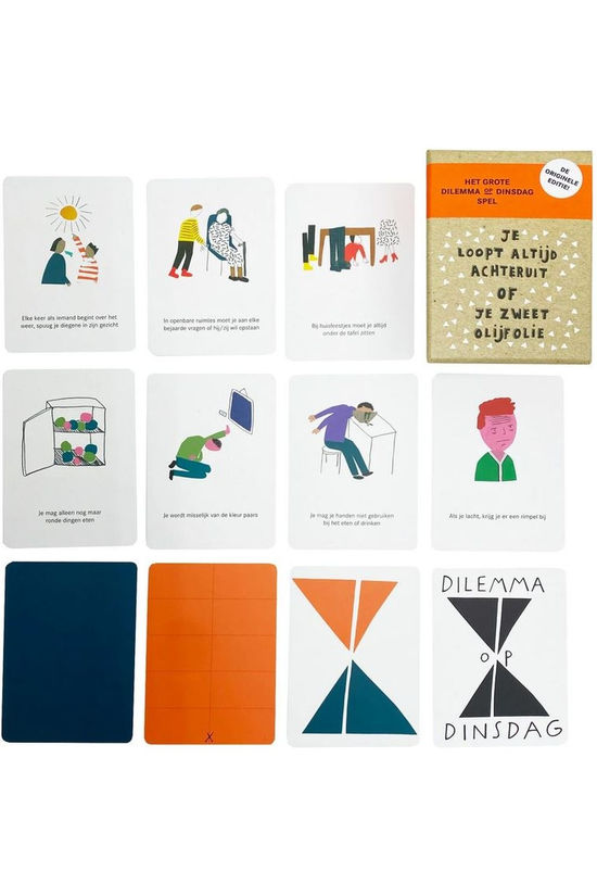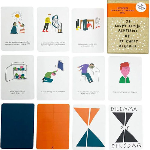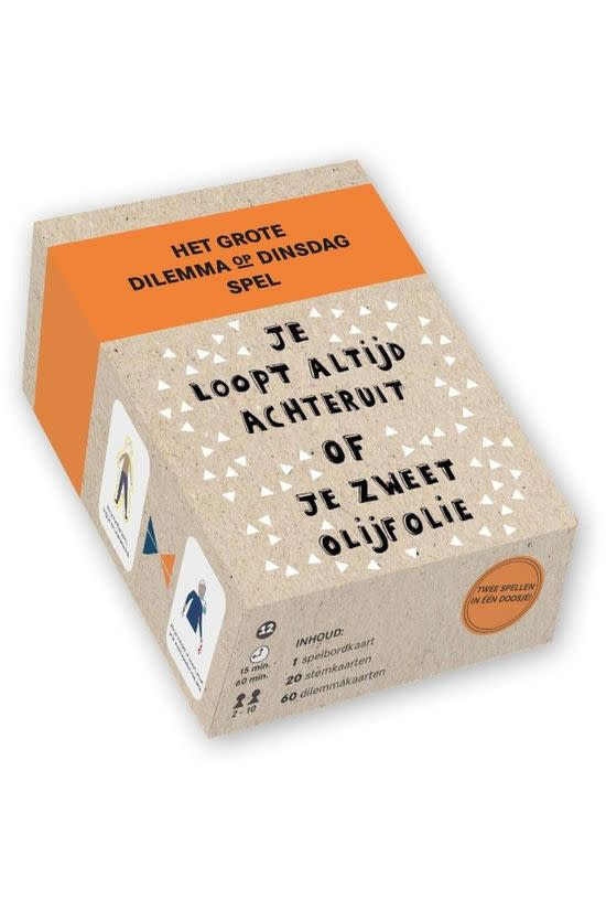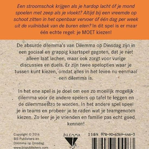 De absurde dilemma's van Dilemma op Dinsdag zijn in een sociaal en grappig kaartspel gegoten, dat je niet alleen laat lachen, maar ook zorgt voor vurige discussies en duels. Er zijn twee spelopties waar je tussen kunt kiezen, omdat alles in het leven nu eenmaal een dilemma is.