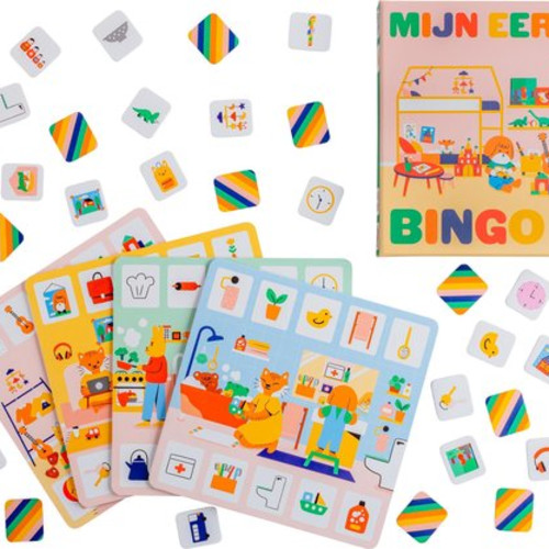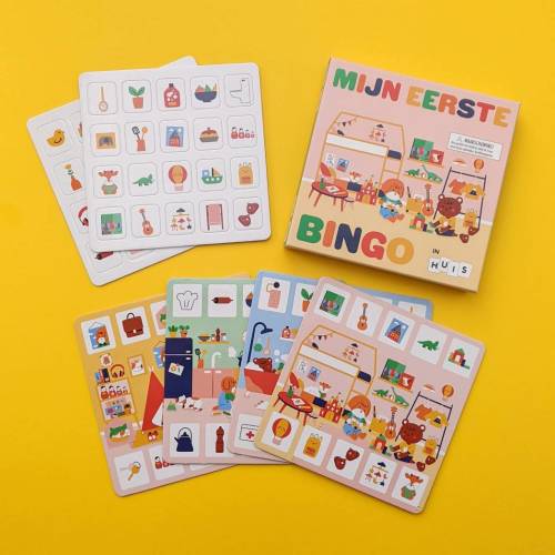 De speelkaarten tonen de slaapkamer, de badkamer, de keuken en de woonkamer, waar kinderen plaatjes zoeken in een bekende omgeving.