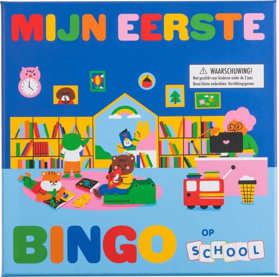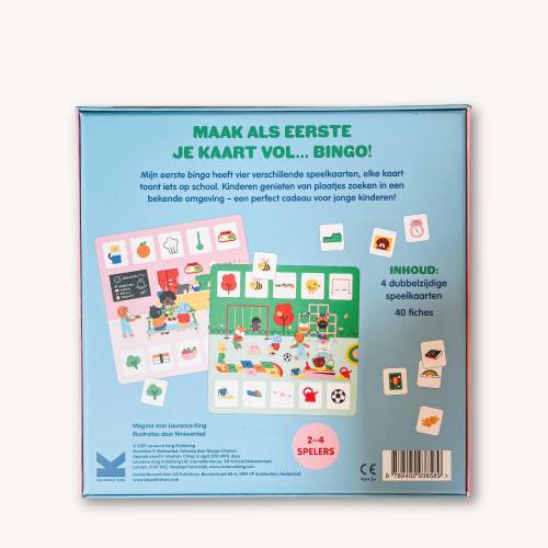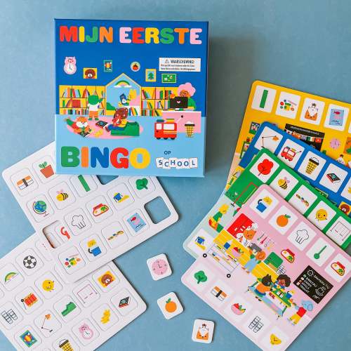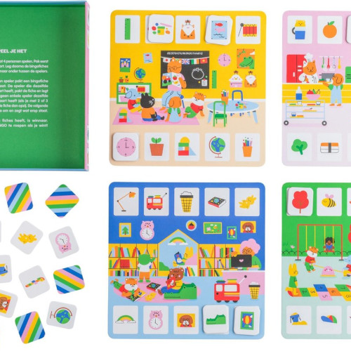 De speelkaarten tonen het klaslokaal, de bibliotheek, de eetzaal en de speelplaats, waar kinderen plaatjes zoeken in een bekende omgeving.