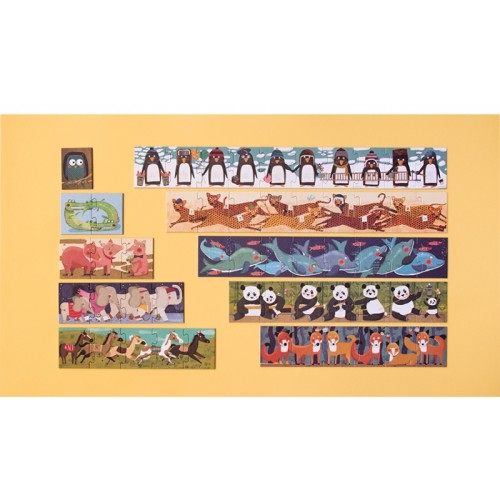 Er zijn 10 verschillende puzzels te maken, van 1 tot 10 stukken. 1 uil, 2 krokodillen, 3 biggetjes,.. tot ja aan de familie van maar liefst 10 pinguïns bent! Ideaal om spelenderwijs te leren tellen en het principe van meer en minder te ontdekken!