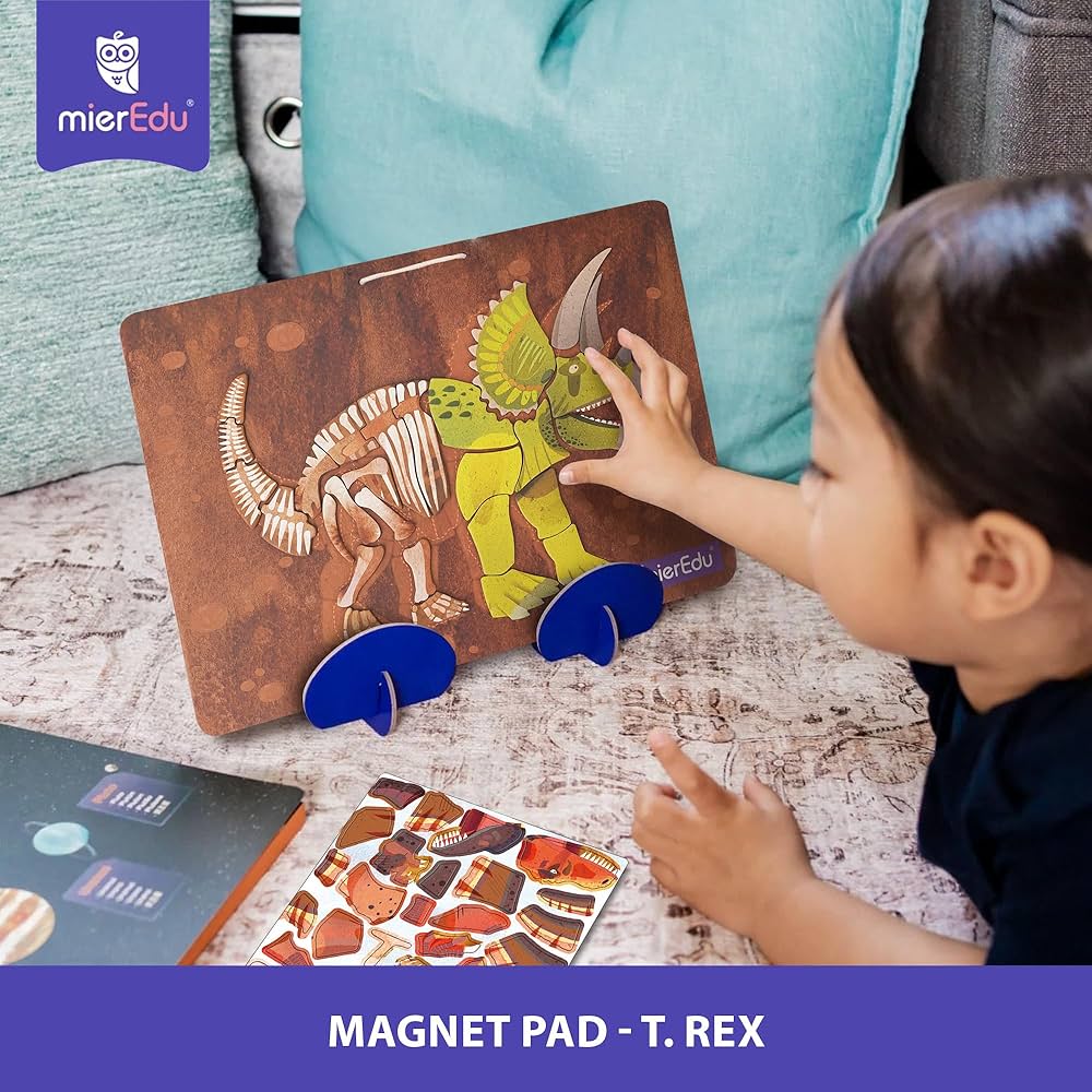 Ontdek meer over de meest fascinerende wezens die ooit op onze aardbol hebben rondgelopen: dinosaurussen. Met de Magnetic Pad houd je kinderen weg van het scherm en leren ze meer over de T-rex, Triceratops of Stegosaurus. De Magnetic Pad is dubbelzijdig. Aan de ene zijde maak je met de magnetische puzzelstukken de dino zelf na, aan de andere zijde het skelet ervan. Je kan de Magnetic Pad rechtzetten of ophangen met de meegeleverde staander en touw.