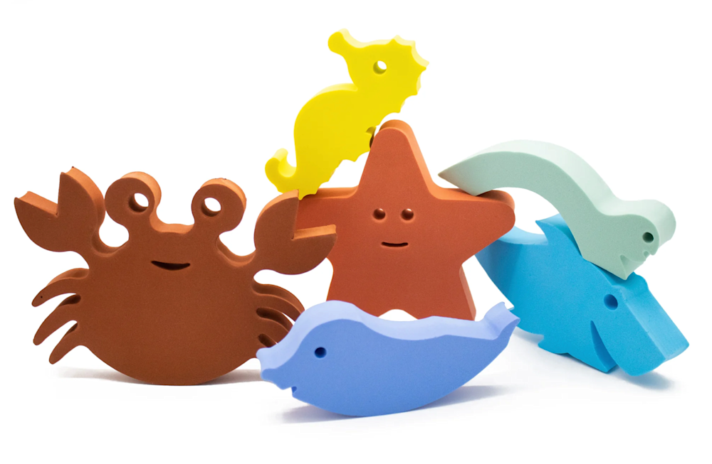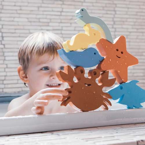Met deze leuke Waterfun set die bestaat uit 6 herkenbare dieren uit de onderwaterwereld beleven kinderen de leukste avonturen in bad, douche, zwembad,... . De dolfijn, krab, zeepaardje, schildpad, zeester en de haai nemen je mee op het leukste onderwater avontuur. De diertjes kunnen blijven plakken aan de bad - of douchewand , je kan een vlot bouwen door de figuurtjes op elkaar te stapelen en nog veel meer met deze unieke Waterfun set van MOES.