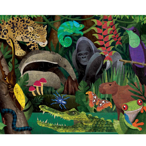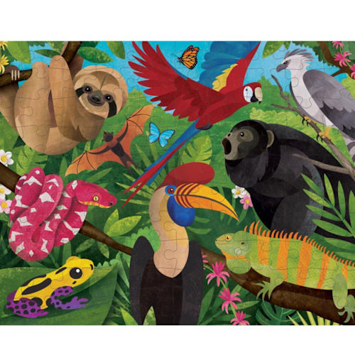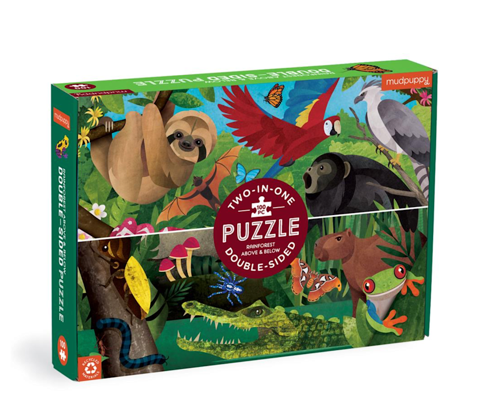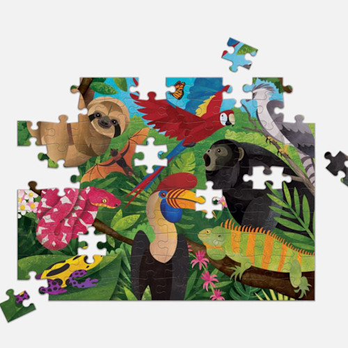 Gek op puzzelen? Met deze puzzel heb je dubbel plezier want je kan hem 2x maken: eentje over het regenwoud vanuit de lucht en eentje vanop de grond ;) Ga samen aan de slag, da's extra gezellig! Inhoud: 100 stukjes Afmetingen: 55x42cm 6+