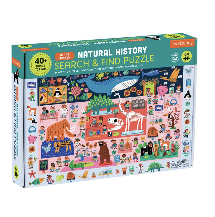 Mudpuppy's Natural History Museum Search & Find Puzzle is dubbel zo leuk! Eerst kunnen kinderen de 64-delige puzzel samenstellen met een divers en kleurrijk assortiment van prehistorische en hedendaagse dieren. Nadat de puzzel in elkaar is gezet, kunnen kinderen hun observatievaardigheden testen om de 40+ museumitems in de rand rond de puzzelafbeelding te vinden. Kun jij ze allemaal vinden?