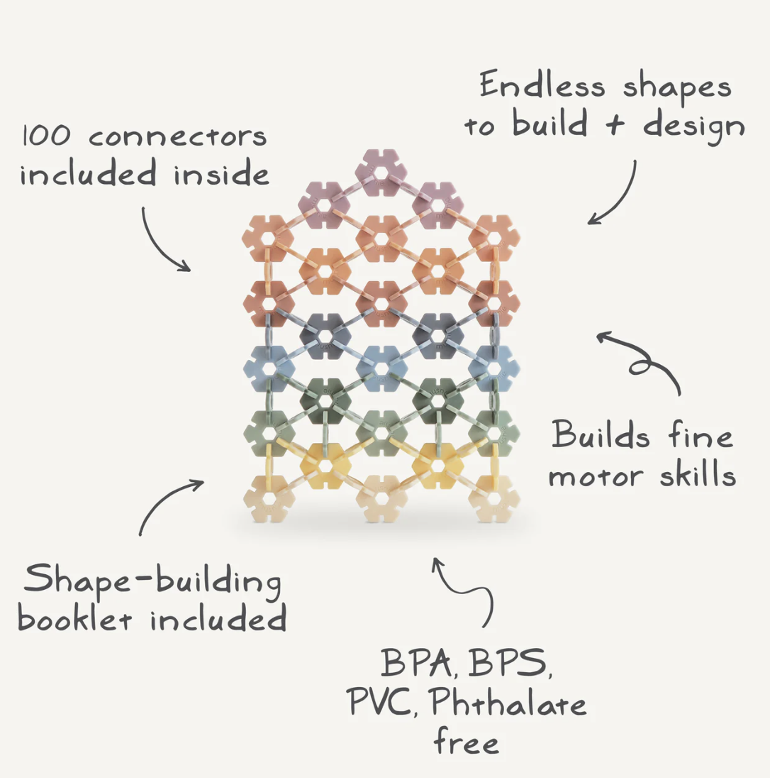Stimuleer de creativiteit en het probleemoplossend denken van je kleintje met de connect toys. Deze 100 hexagons zorgen voor eindeloos puzzelplezier en mogelijkheden. De zachte kleuren vloeien samen in een uniek design..