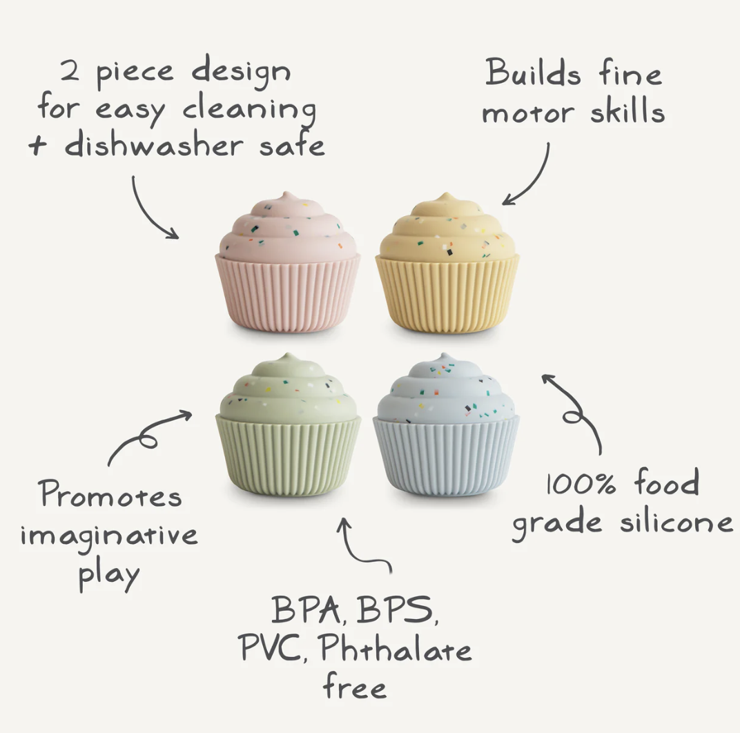 Voeg wat zoets toe aan je spel dankzij deze schattige mix & match siliconen cupcakes. Kleine handjes kunnen op zoek naar de juiste kleurcombinaties of kunnen juist creatief aan de slag door leuke combo's te creëren. Alles kan. Ideaal voor fijne motoriek en hand/oog coördinatie. Met kleine gaatjes onderaan om eenvoudig schoon te maken. Een leuke add-on in je speelkeukentje of in bad.