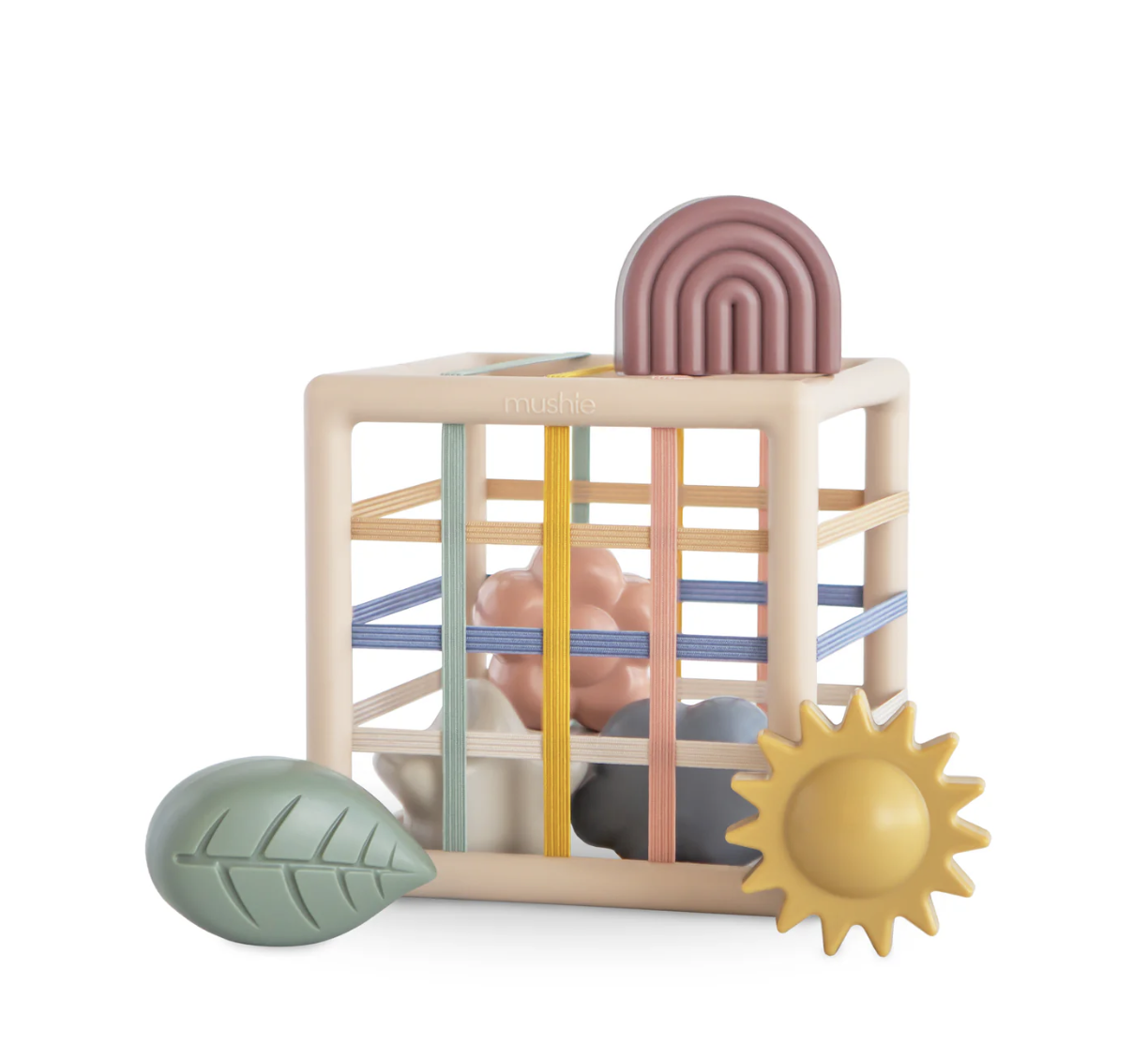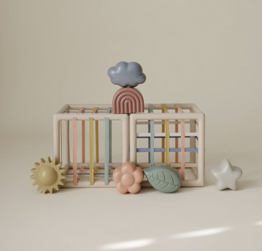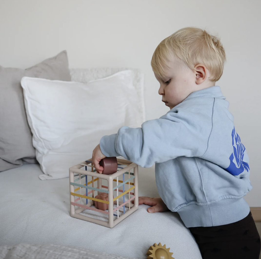 Deze leuke shape sorter zet in op tactiel spel met zachte kleuren. Gemaakt voor kleine handjes die de vormen in de box proberen passen dankzij de zachte, flexible openingen. Ideaal voor fijne motoriek, hand-oogcoördinatie en vroeg probleemoplossend denken.