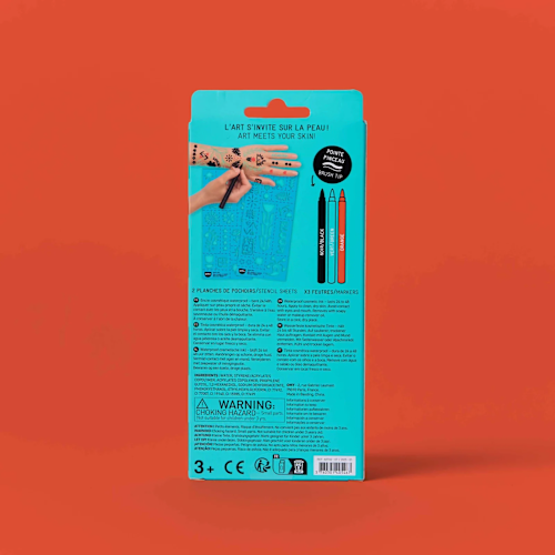 Laat je creativiteit de vrije loop met deze speciaal voor de huid gemaakte stiften (zwart, groen en oranje). De inkt droogt snel en blijft tot 2 dagen zitten zonder uit te lopen.