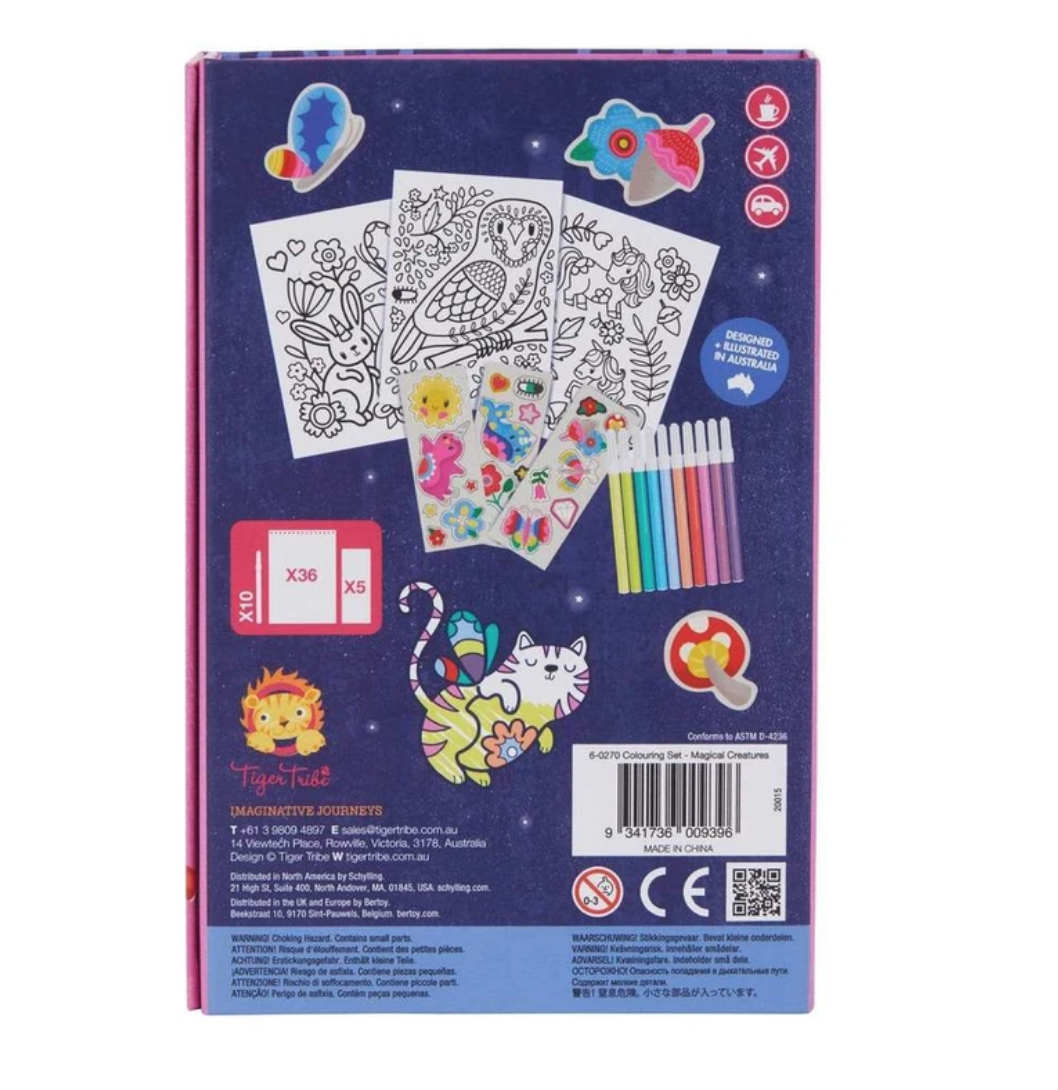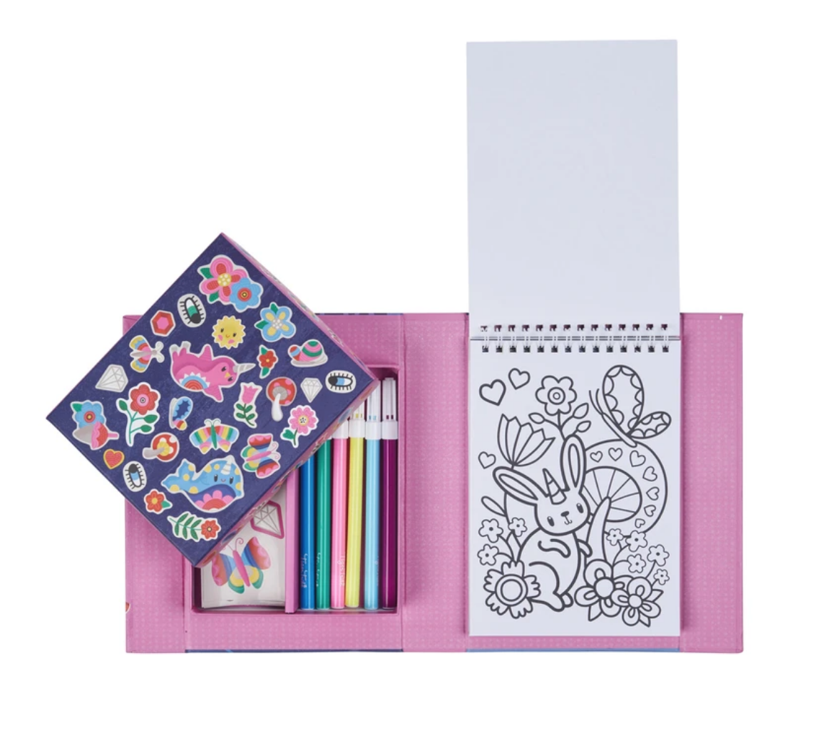 Een leuke, compacte kleur/sticker set. Ideaal om mee te nemen onderweg of op restaurant. Leeftijd : vanaf 3 jaar Bevat : 36 kleurplaten, 5 leuke sticker vellen, 10 kleurstiften in een mooie opbergbox.