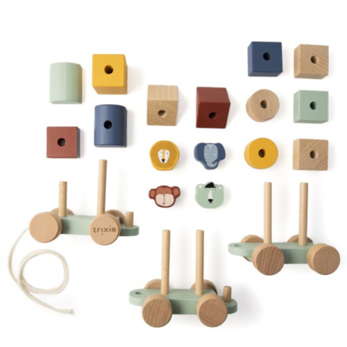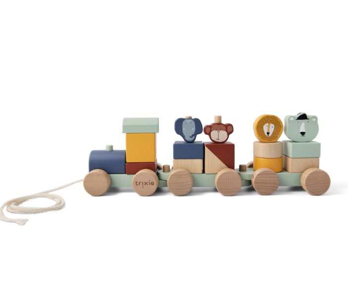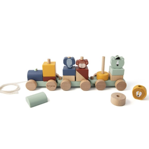 Spring op de trein met onze dierenvrienden! Met alle verschillende blokken in verschillende kleuren, kun je je eigen wagons maken. Gebruik het touwtje aan de voorkant om je trein mee te trekken op de leukste avonturen! De trein en al zijn elementen zijn gemaakt van 100% FSC © gecertificeerd hout. Alle verven zijn op waterbasis en veilig voor baby's.