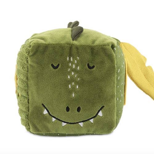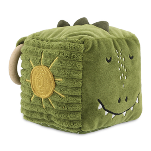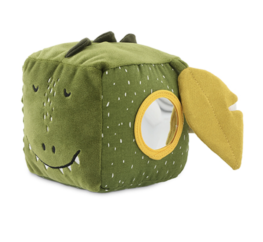 Zacht, leuk om in te knijpen en vol boeiende verrassingen. Deze activiteitenkubus met een lief gezichtje belooft uren ontdekkingsplezier. Hij heeft verschillende texturen, pootjes, een staart, een spiegeltje, een knisperende vulling en een houten én silicone ring. Perfect om op te kauwen en om hem te dragen.