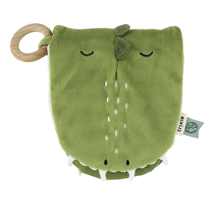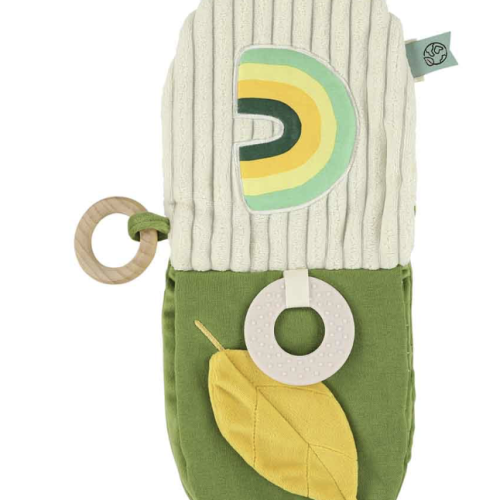 Materialen: biologisch katoen - katoen - gerecycleerd polyester - bijtring - spiegel - houten ring - knisperpapier
